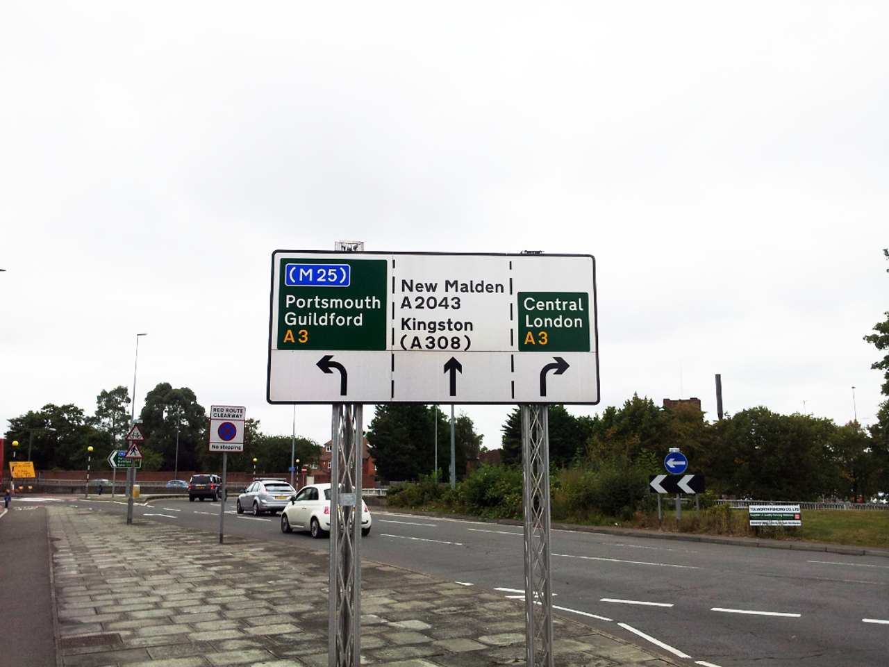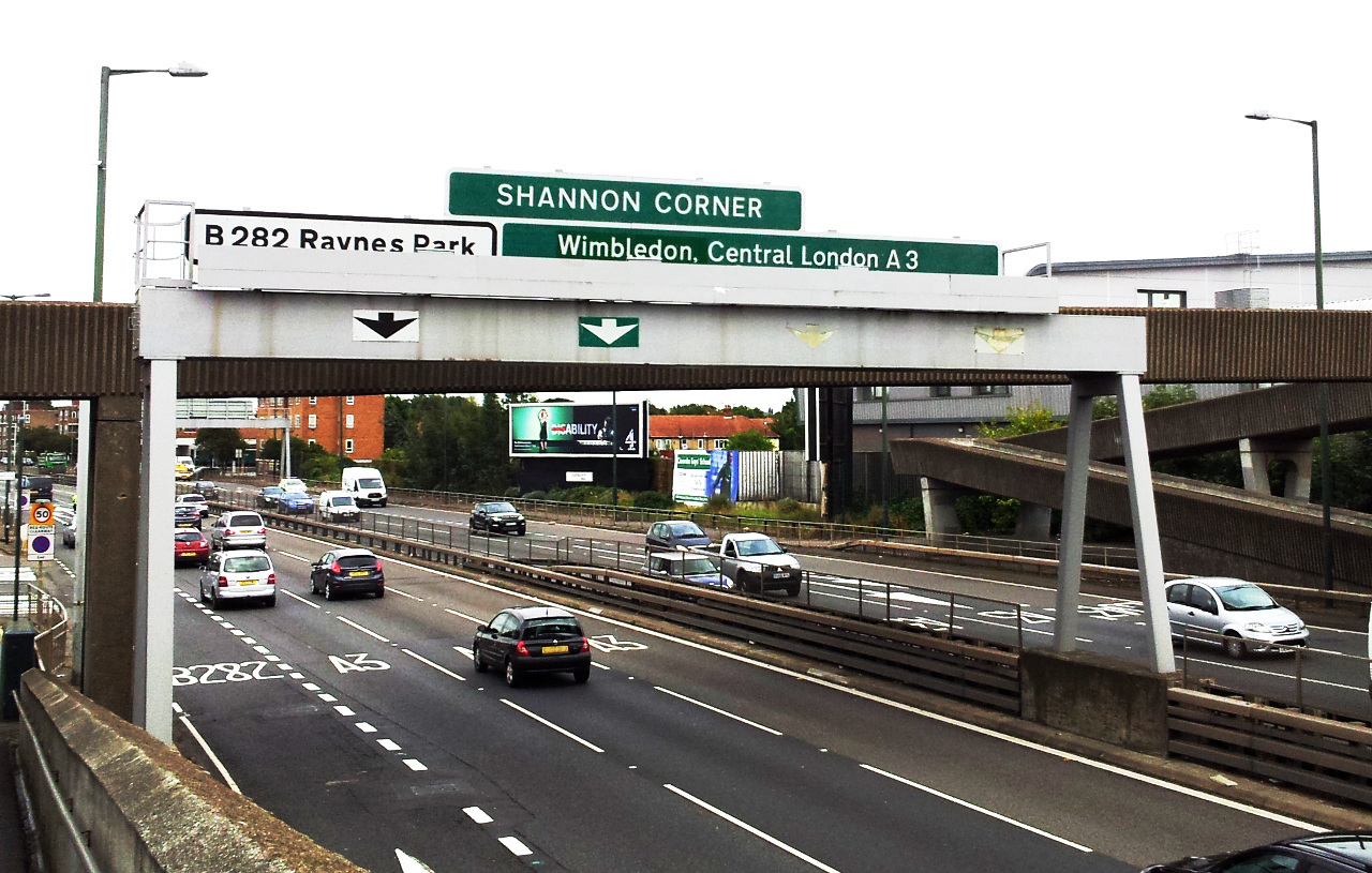 Join A3 northbound at New Malden and taking exit at Shannon Corner.